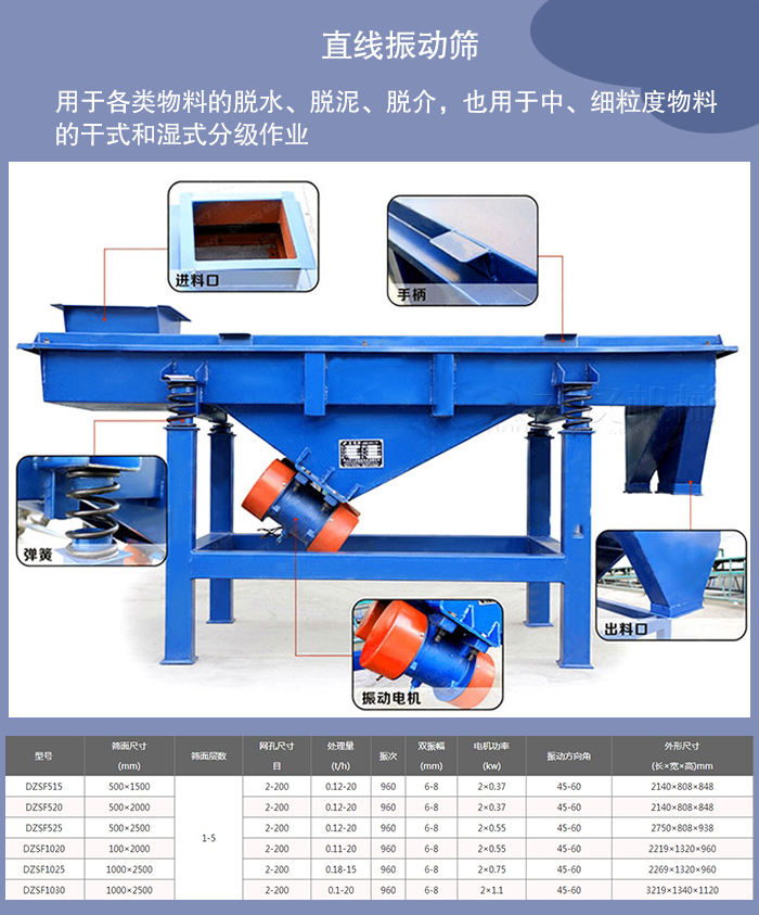 直線振動篩篩箱的運(yùn)動軌跡為直線或接近直線,它有兩個(gè)軸,所以又稱雙軸振動篩。直線振動篩水平或傾斜安裝,這類振動篩結(jié)構(gòu)緊湊,運(yùn)行平穩(wěn),被廣泛用于各類物料的脫水、脫泥、脫介,也用于中、細(xì)粒度物料的干式和濕式分級作業(yè)。我廠生產(chǎn)的直線振動篩種HZSF型號就是直線振動篩代表性的產(chǎn)品。
