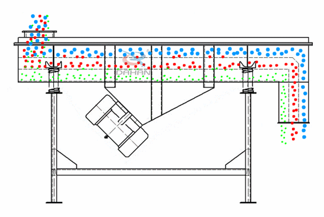 原理是利用振動電機(jī)激振器作為振動源,使物料在篩網(wǎng)上被拋起,同時向前作直線運(yùn)動,物料從給料機(jī)均勻地進(jìn)入篩分機(jī)的進(jìn)料口,通過多層篩網(wǎng)產(chǎn)生數(shù)種規(guī)格的篩上物、篩下物、分別從各自的出口排出。