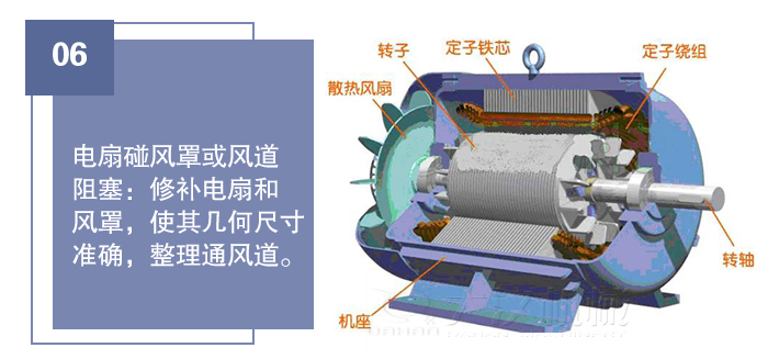 9、電扇碰風(fēng)罩或風(fēng)道阻塞:修補電扇和風(fēng)罩,使其幾何尺寸準(zhǔn)確,整理通風(fēng)道。