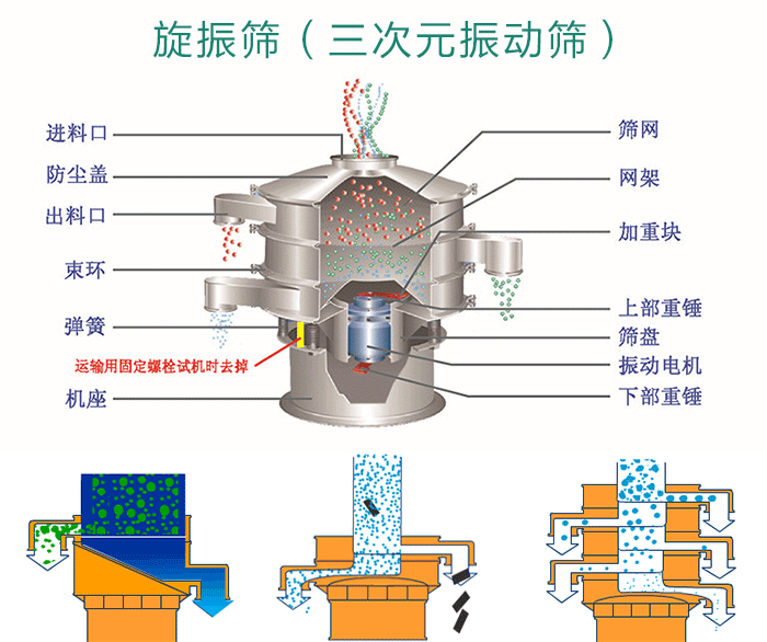 旋振篩又名(三次元振動(dòng)篩)的外形結(jié)構(gòu)可以分為:進(jìn)料口、防塵蓋、篩網(wǎng)、網(wǎng)架、出料口、束環(huán)、彈簧、篩盤(pán)和底座;