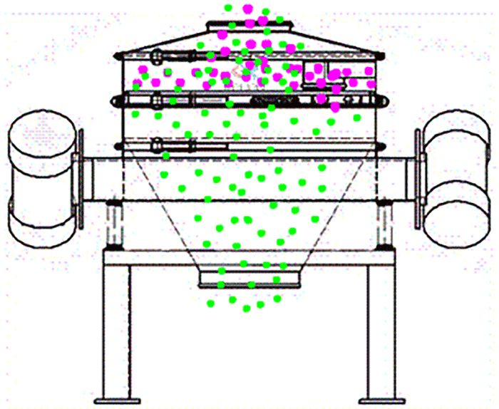 旋振篩是由電機(jī)提供振動(dòng)源,從進(jìn)料口投入物料,在振動(dòng)狀態(tài)下穿過(guò)篩網(wǎng)直到出料口;防塵蓋、束環(huán)是為振動(dòng)篩提供封閉狀態(tài)的。