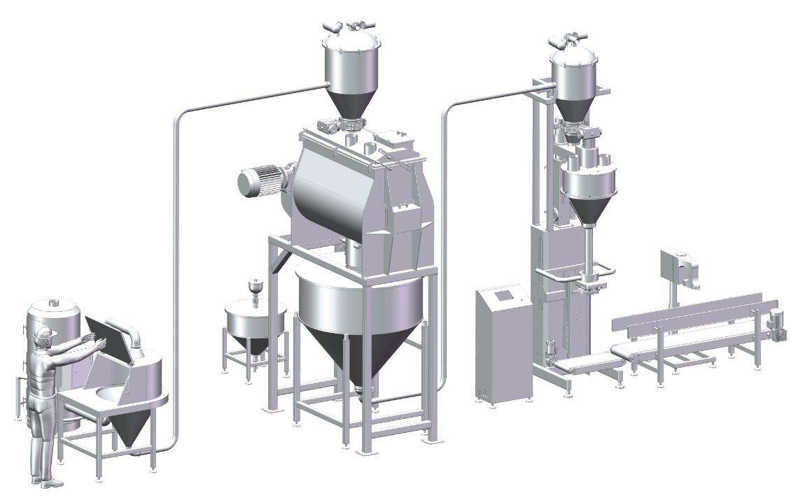 當小袋物料需要拆包倒入下道工序時,只需人工直接拆包放入系統(tǒng)即可。給料過程中產生的物料粉塵由除塵風機收集。物料通過振動篩(安全篩)攔截散狀物料和異物,保證符合要求的顆粒順利輸入。
