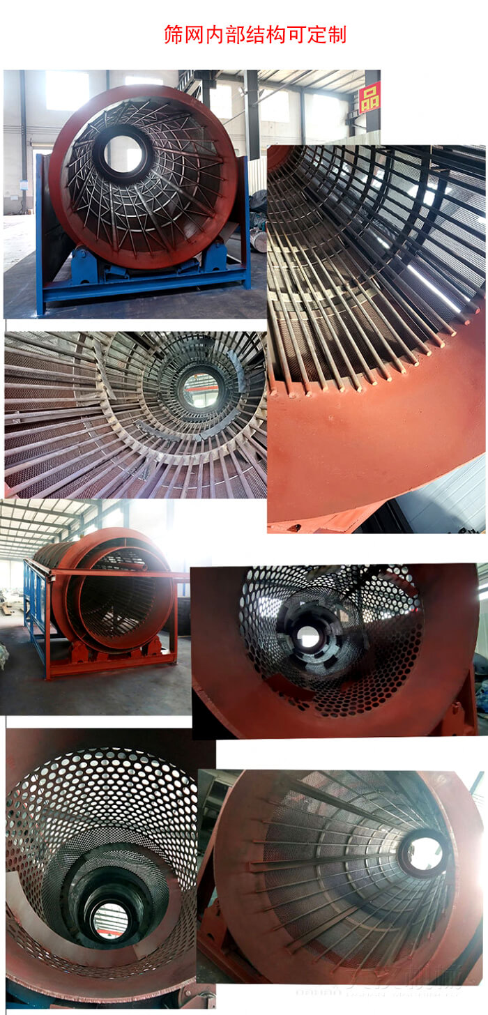 重型滾筒篩的結(jié)構(gòu)相對簡單,主要由滾筒裝置、電動(dòng)機(jī)、減速機(jī)和篩網(wǎng)等組成。滾筒裝置傾斜安裝于機(jī)架上,電動(dòng)機(jī)通過減速機(jī)與滾筒裝置連接,驅(qū)動(dòng)滾筒繞其軸線轉(zhuǎn)動(dòng)