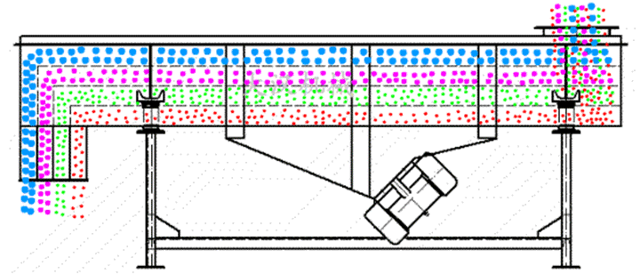 粉煤灰振動(dòng)利用振動(dòng)電機(jī)激振作為振動(dòng)的振動(dòng)來源,使物料在篩網(wǎng)拋起,同時(shí)向前作直線運(yùn)動(dòng),物料從給料均勻地進(jìn)入振動(dòng)篩機(jī)的進(jìn)料口,通過多層篩網(wǎng)網(wǎng)孔大小的不同控制物料顆粒的大小,從而保證不同的物料在不同層級(jí)中被排出篩箱外。