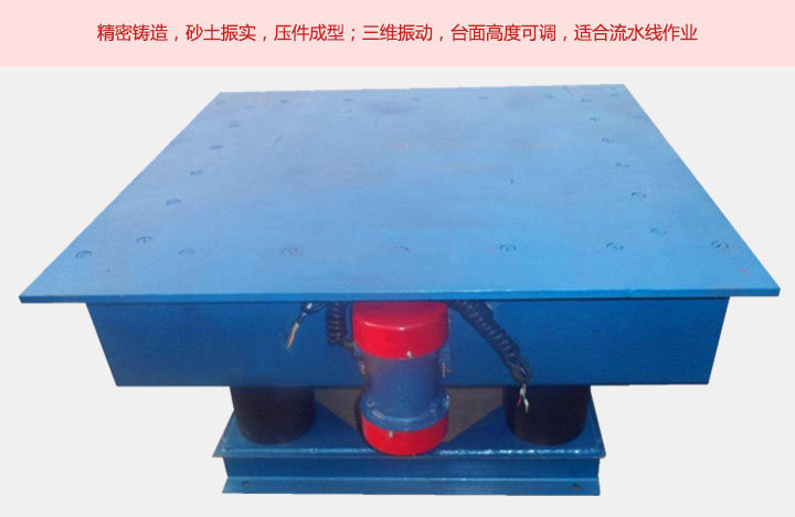 鑄造用振動(dòng)平臺(tái)采用橡膠彈簧和6臺(tái)-8臺(tái)振動(dòng)電機(jī)組合,具有上下,左右前后的三維振實(shí)效果,它具有多結(jié)構(gòu)支撐,結(jié)構(gòu)牢固,密封性好,性能可靠,操作簡(jiǎn)單,振動(dòng)頻率可調(diào)等特點(diǎn)。