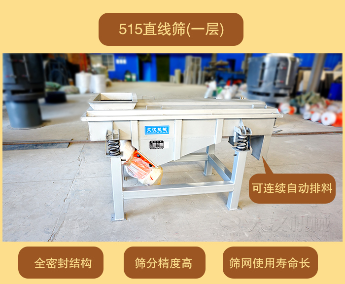 DZSF-515直線(寬)500mm×1500mm(長),體積小移動方便,價格便宜。大漢直線振動篩廠家可為客戶量身定做特殊要求的直線振動篩(單層或多層)。515直線振動篩按材質(zhì)分為304不銹鋼材質(zhì)和碳鋼材質(zhì)。