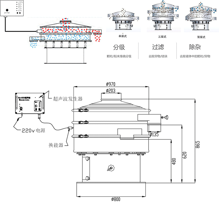 超聲波振動(dòng)篩是在原有的電機(jī)帶動(dòng)振動(dòng)篩振動(dòng)的基礎(chǔ)上,增加了超聲波系統(tǒng)。振動(dòng)篩堵網(wǎng)的問題是制約篩分效率的關(guān)鍵,堵網(wǎng)問題解決了,其他問題就迎刃而解.超聲波裝置是由超聲波電源通過(guò)換能器將超聲波轉(zhuǎn)換為每秒37000次的高頻機(jī)械波作用于篩網(wǎng)表面。來(lái)起到清理篩網(wǎng)的作用。解決了由于篩孔上的靜電附著力,粉末的凝聚作用和插入粗糙網(wǎng)絲表面的微粒而造成的堵塞問題。提高了篩分效率。